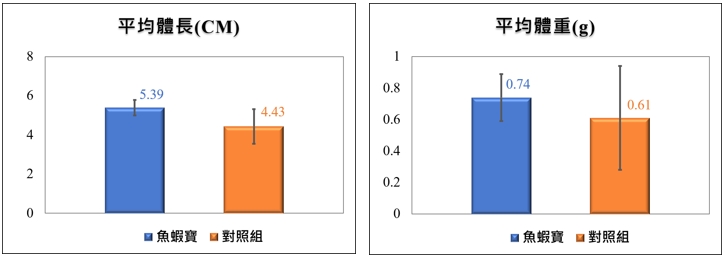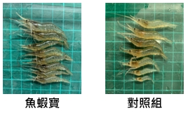 持續使用魚蝦寶6週後,採樣兩池蝦隻進行比較,發現試驗池不但體型較對照組大,且更加整齊均勻,讓業者在投餵管理上更容易。兩池蝦隻在重量上也有明顯差異,整體看起來使用魚蝦寶後蝦體健康狀況更加良好!