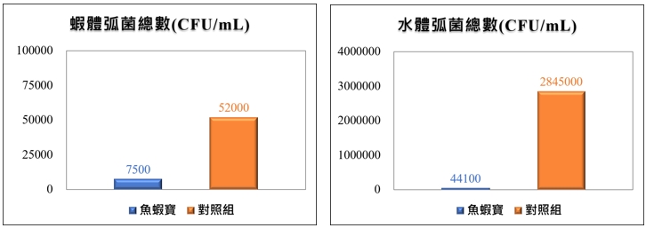 在高密度的飼養環境下,弧菌感染是相當好發的一種疾病,在我們的試驗中發現,持續使用魚蝦寶6週後,可以有效減少蝦隻腸道內(減少85.6%)及蝦池池水中(減少98.4%)的弧菌量,讓蝦體更加穩定。建立優良的益生菌菌相,不但能降低感染的風險,還能讓蝦隻將身體能量都投資在成長上,提升成長的速度!