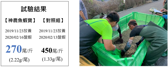 兩池最終先後於02/13、02/16盤蝦,對照組放養時間為82天,平均尺寸450尾斤已經算是不錯的成績了,而全程使用魚蝦寶的試驗池在放養85天後,蝦隻尺寸則達270尾斤!幾乎相同的放養時間下,試驗池體型比對照組大將近7成!真是可喜可賀!這樣卓越的效果連業者本人都讚不絕口!