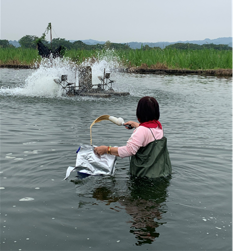 放養蝦苗時即開始在試驗池使用魚蝦寶,將魚蝦寶菌粉倒入桶中,並加入適量池水混合後,均勻潑灑在池中。為了盡可能使益生菌能均勻散佈在池水中,可藉由水車的水流來增加益生菌擴散的速度。
