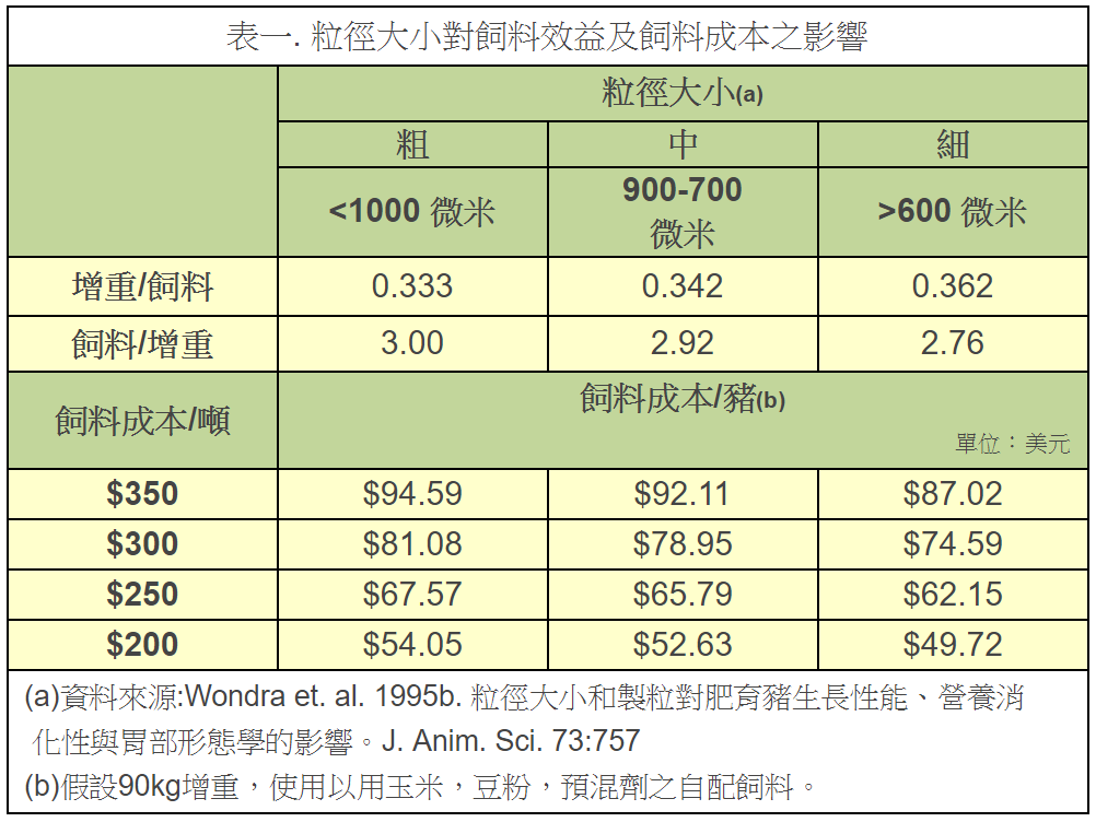 有許多刊物探討各種穀物粒徑對飼料效率的影響。堪薩斯州立大學的研究人員發現一個可靠的數字依據,以生長階段的豬隻來說:玉米粒徑每減低100微米則可改善1.2至1.4%的飼料效率。當這個規則應用於各種飼料成本計算時,便可明白為何要強調粉碎度的重要性了(表一)。